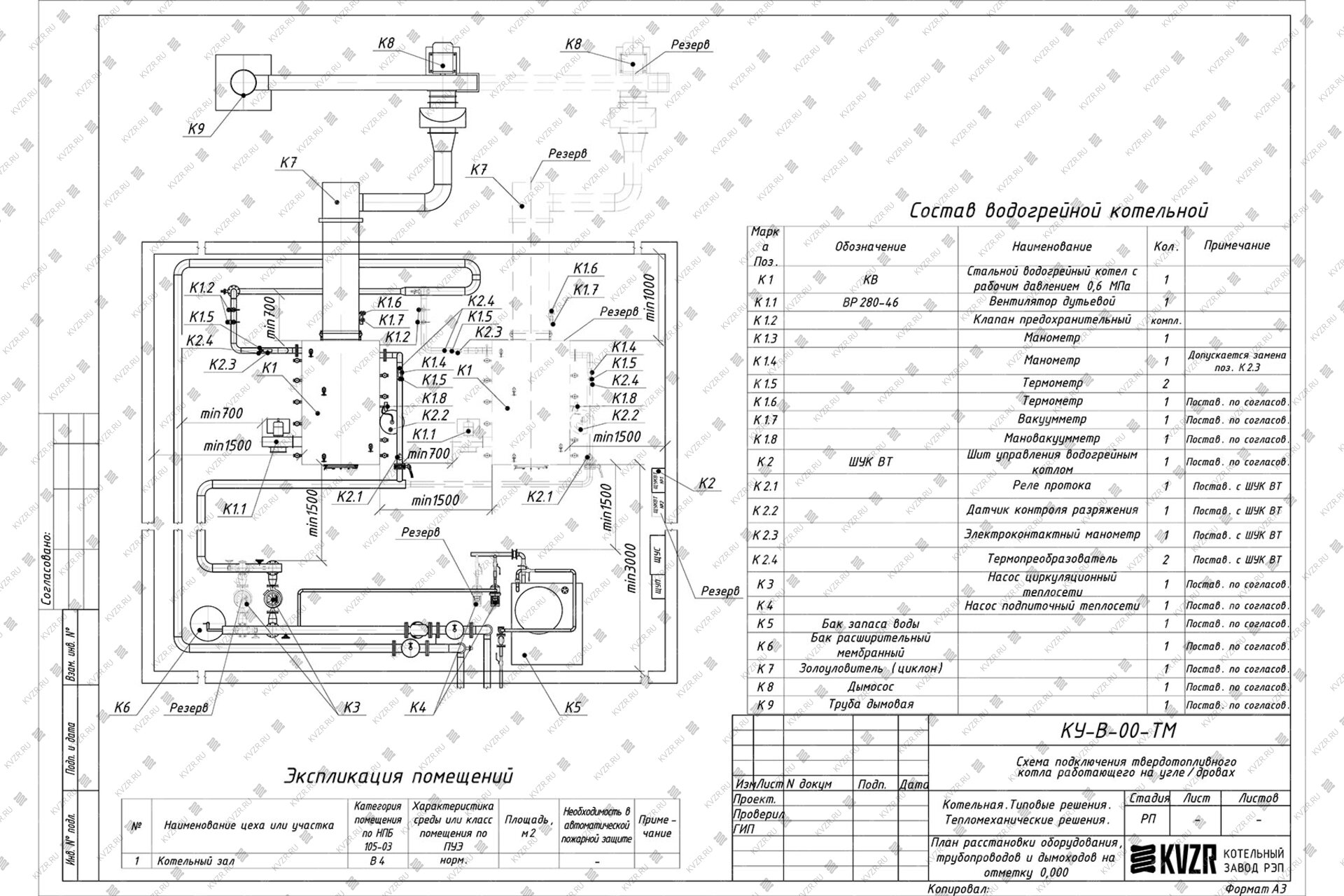 Чтобы правильно подключить котел 0.4 МВт уголь дрова в котельной необходимо оставить проемы для обслуживания оборудования во время эксплуатации. На представленной здесь схеме указаны их минимальные размеры. Кроме того, в данной примерной схеме монтажа водогрейных котлов и оборудования указан перечень минимально необходимого вспомогательного оборудования для правильной работы котла.