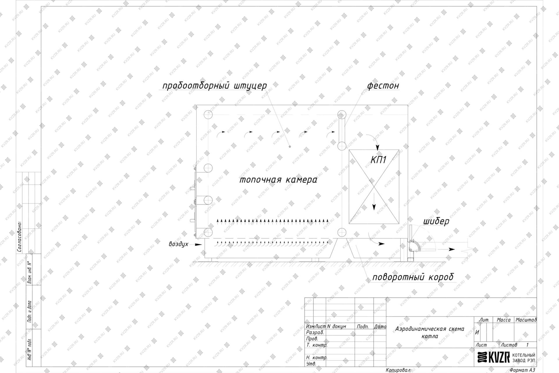 Автоматика котла по данным тягонапорометра производит контроль разряжения в топочной камере, блокируя работу вентилятора в случае снижения разряжения в топочной камере, и исключая выбивание дымовых газов из топки в котельный зал. Из топки дымовые газы поступают в первый конвективный пакет, разворачиваются в поворотном коробе и через второй конвективный пакет выходят в газоходы котельной.