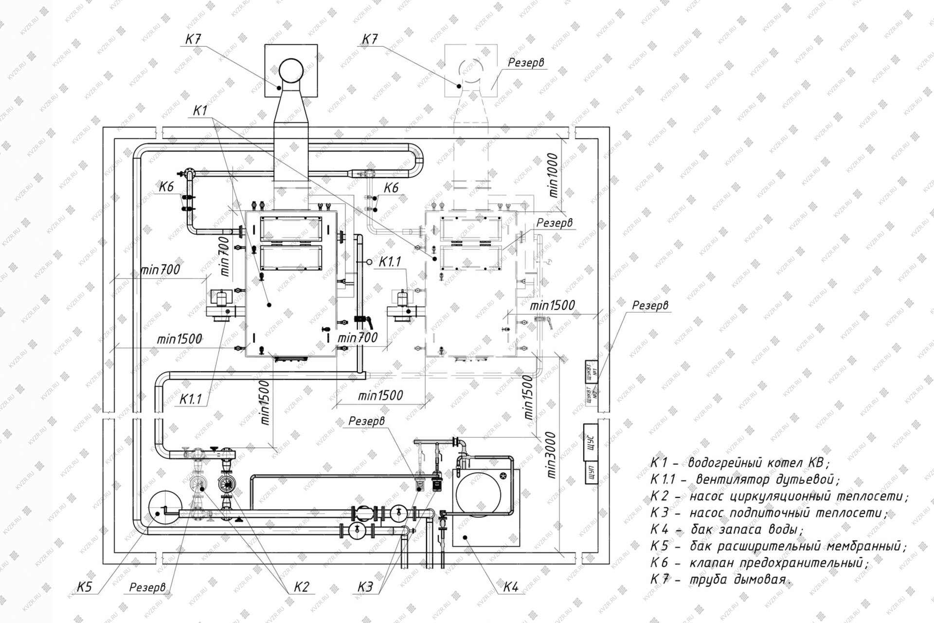 Чтобы правильно подключить котел 400 кВт на естественной тяге в котельной необходимо оставить проемы для обслуживания оборудования во время эксплуатации. На представленной здесь схеме указаны их минимальные размеры. Кроме того, в данной примерной схеме монтажа водогрейных котлов и оборудования указан перечень минимально необходимого вспомогательного оборудования для правильной работы котла.