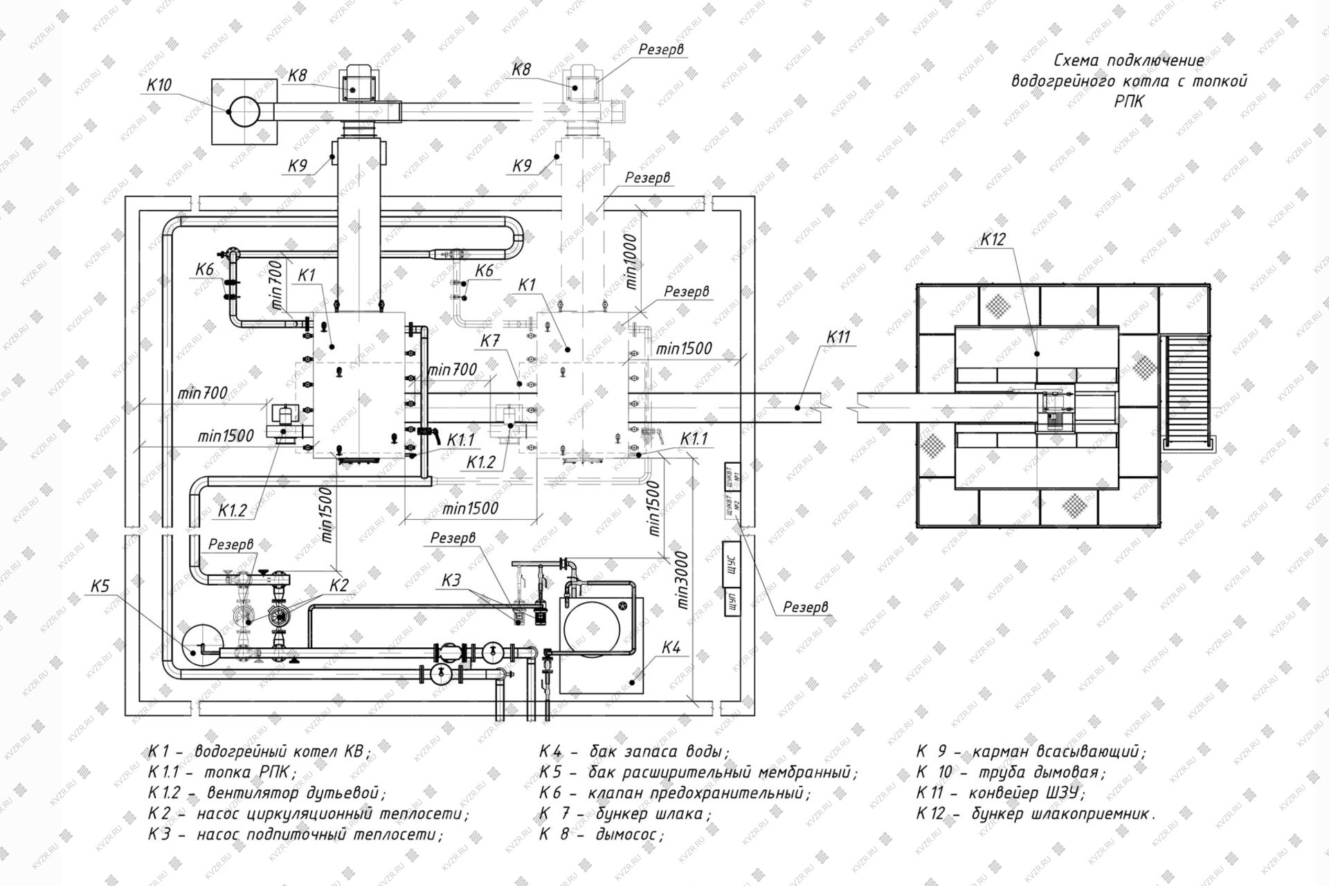 Чтобы правильно подключить котел КВм-0,8 с топкой РПК в котельной необходимо оставить проемы для обслуживания оборудования во время эксплуатации. На представленной здесь схеме указаны их минимальные размеры. Кроме того, в данной примерной схеме монтажа водогрейных котлов и оборудования указан перечень минимально необходимого вспомогательного оборудования для правильной работы котла.