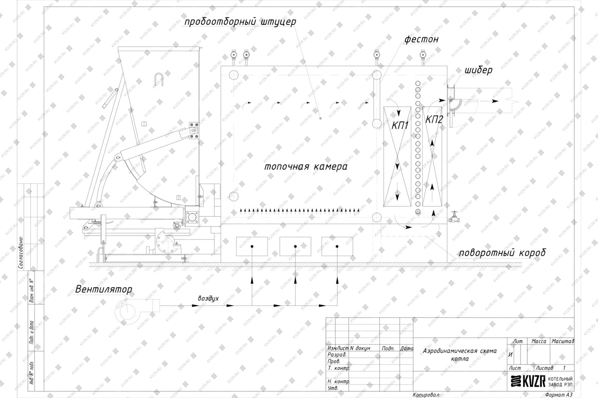 Воздух в механический водогрейный котел КВм-1.4 с ТШПМ подается вентилятором поддува через топочный короб под слой твердого топлива для обеспечения горения. На боковой панели топки котла имеется пробоотборочный штуцер для подключения манометра и тягонапорометра.