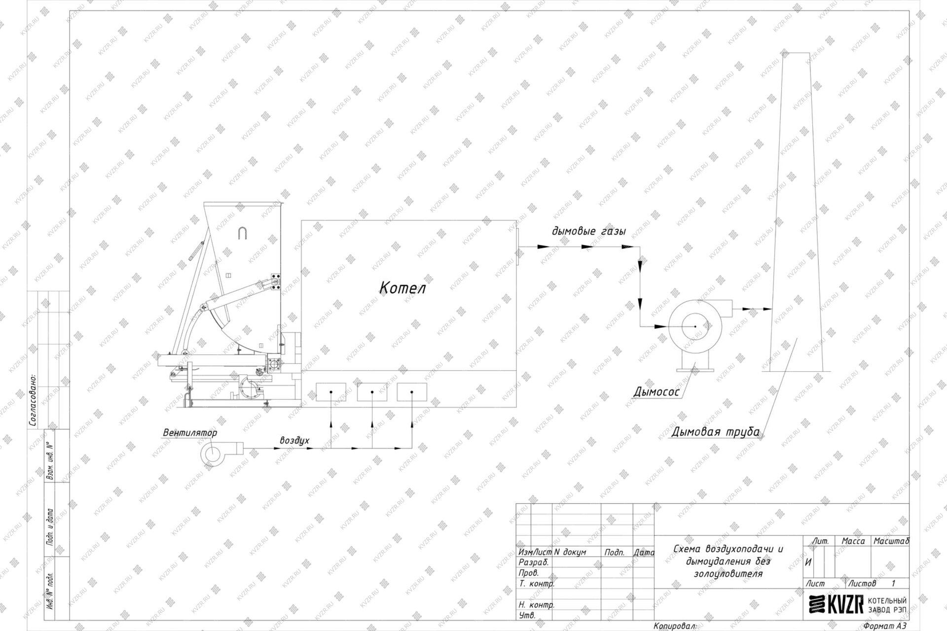 В случае, если степень очистки дымовых газов высокая не требуется, можно установить котел КВм-1.4 с ТШПМ без золоуловителя. Схема подключения при этом следующая - дымовые газы выходят из котла в газоходы котельной, затем в дымосос и далее снова по газоходам в дымовую трубу. В зависимости от компоновки котельной дымосос может устанавливаться как в котельной, так и на улице. Наш завод производит газоходы и переходники к ним. Получив схему вашей котельной мы можем изготовить для вас комплект газоходов, переходников нужных размеров и сечений. На месте такие детали собираются как конструктор. Обращаем ваше внимание, что газоходы требуют изоляции, для защиты персонала от ожогов, так как уходящие газы имеют высокую температуру, а на улице газоходы требуют изоляции для избежания образования конденсата.