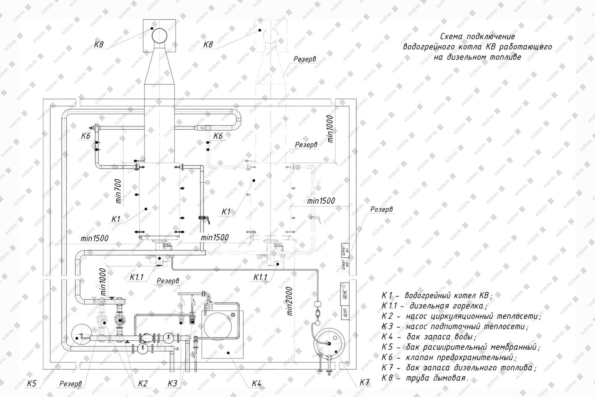 Чтобы правильно подключить котел 1.1 МВт на дизеле в котельной необходимо оставить проемы для обслуживания оборудования во время эксплуатации. На представленной здесь схеме указаны их минимальные размеры. Кроме того, в данной примерной схеме монтажа водогрейных котлов и оборудования указан перечень минимально необходимого вспомогательного оборудования для правильной работы котла.